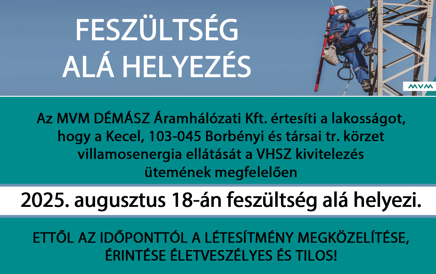Az MVM DÉMÁSZ Áramhálózati Kft. értesíti a lakosságot, hogy a 103-045 Borbényi és társai tr. körzet villamosenergia ellátása a VHSZ kivitelezés ütemének megfelelően 2025. augusztus 18-án feszültség alá helyezi.