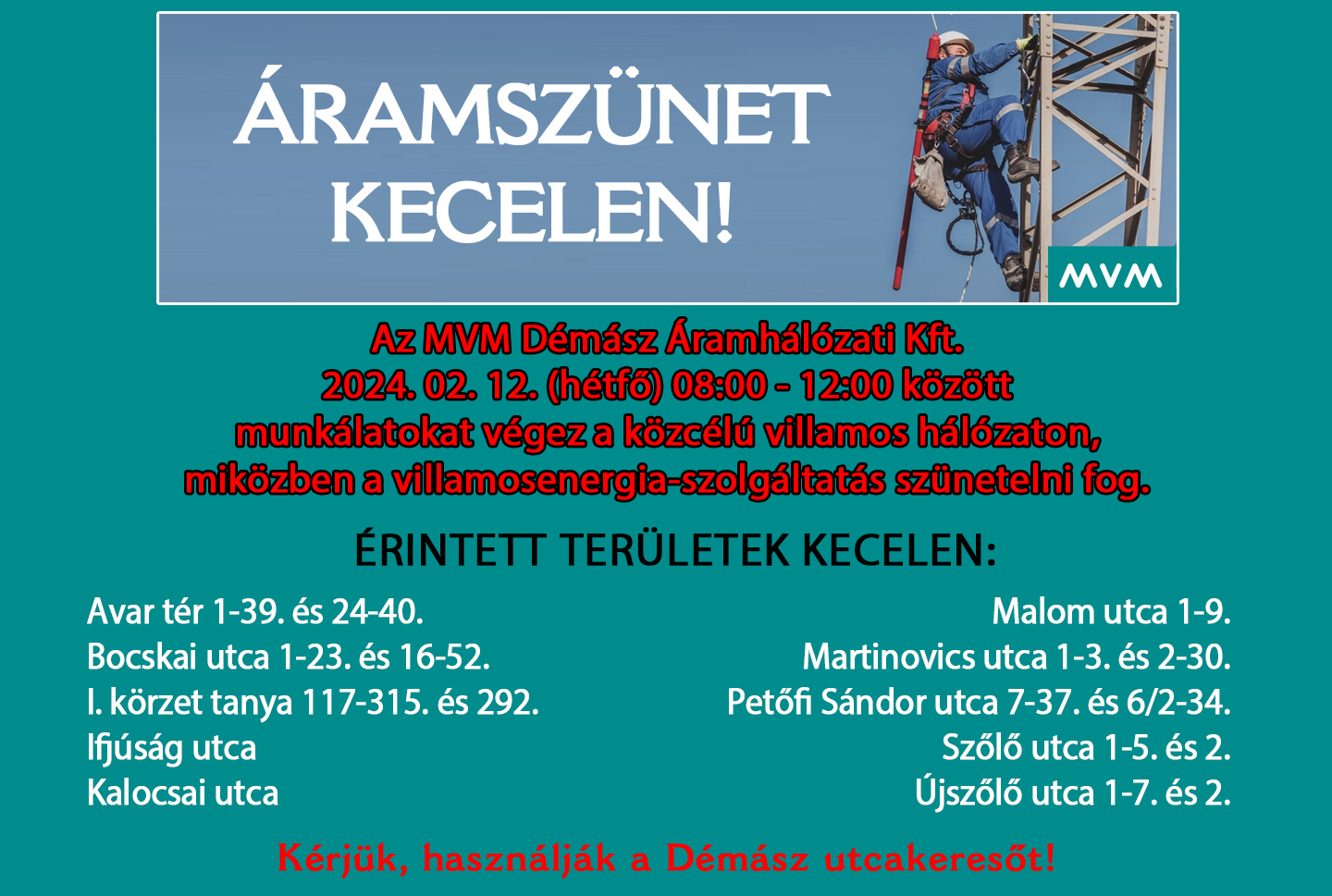 Áramszünet lesz Kecelen! - 2024. 02. 12.