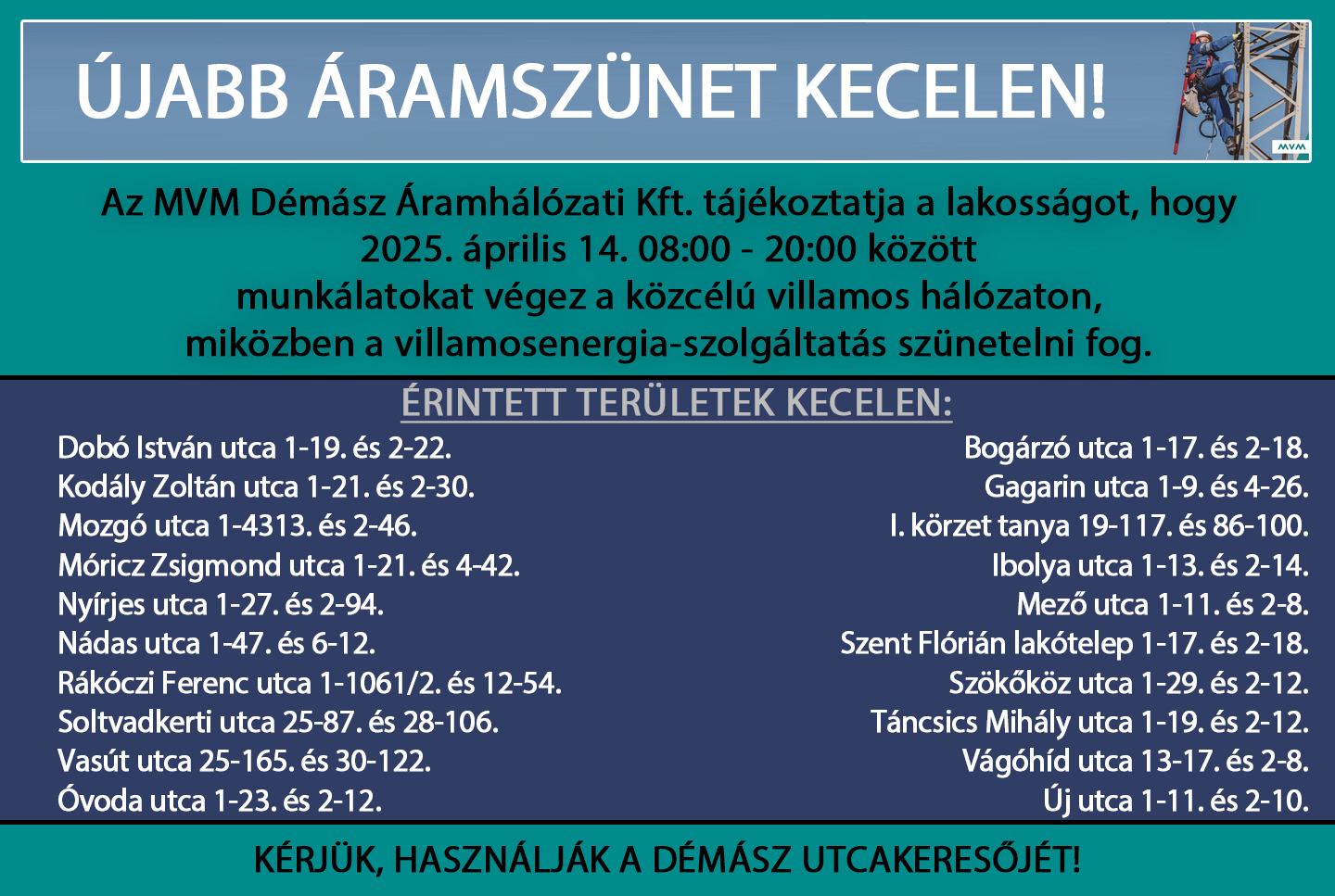 2025. április 14-én 8-20 óra között ismét áramszünet lesz Kecelen!