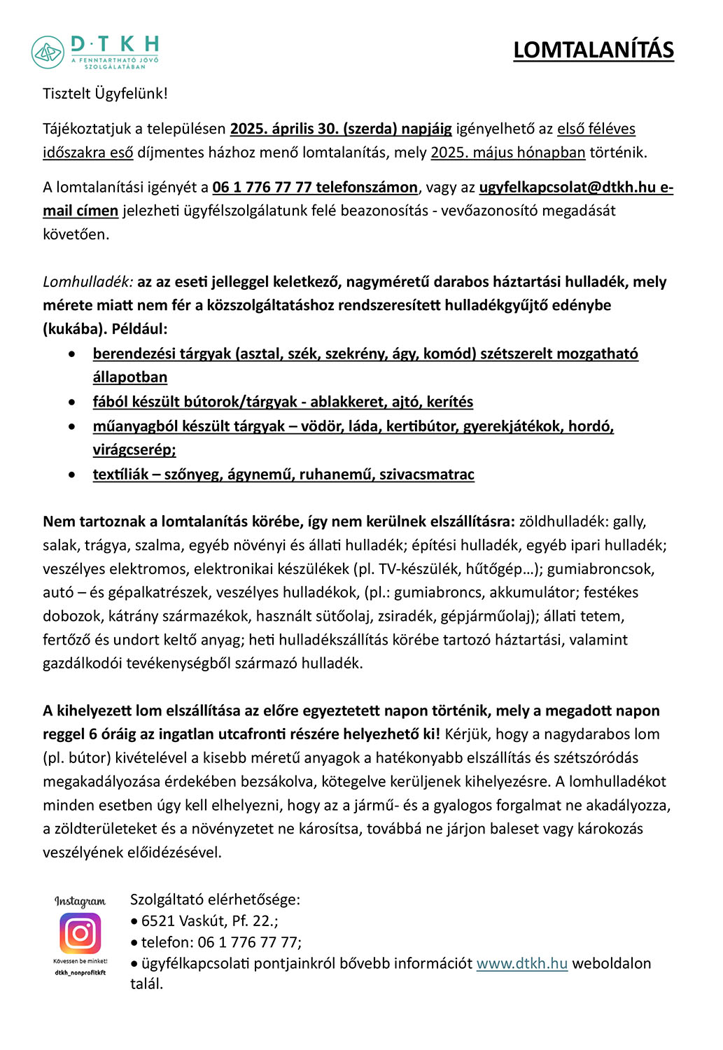 Szolgáltatói tájékoztató keceli lakosok részére a 2025-ös év első félévére eső díjmentes lomtalanításról. ...