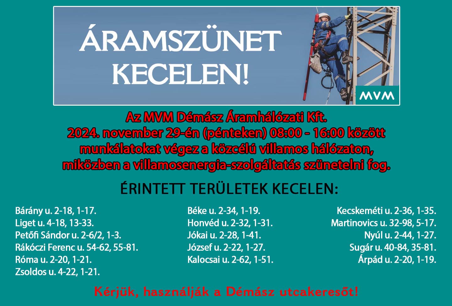 Áramszünet lesz Kecelen! - 2024. 11. 29.