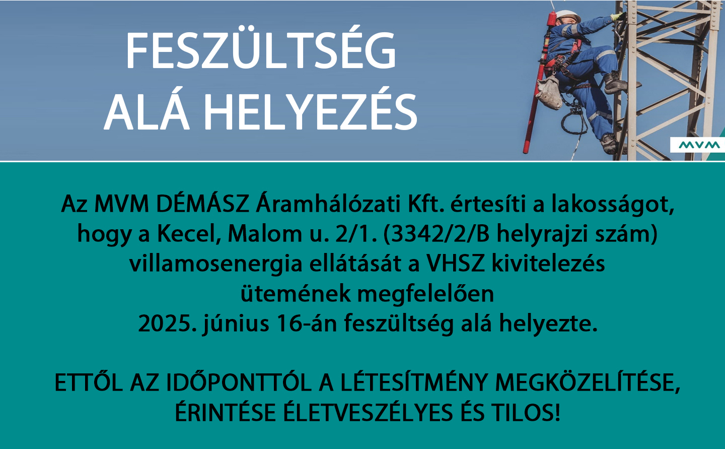Az MVM DÉMÁSZ Áramhálózati Kft. értesíti a lakosságot, hogy a Kecel, Malom u. 2/1 (3342/2/B helyrajzi számú) villamosenergia ellátása a VHSZ kivitelezés ütemének megfelelően 2025. június 16-án feszültség alá helyezte.