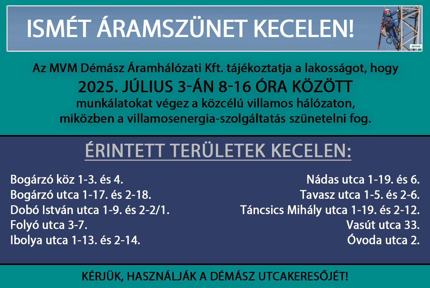 2025. július 3-án 8-16 óra között ismét áramszünet lesz Kecelen!