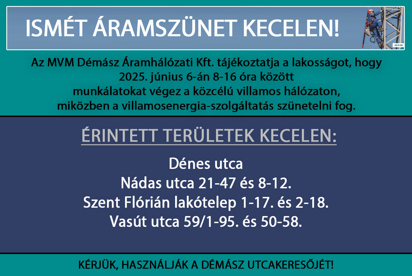 2025. június 10-én és június 11-én 8-16 óra között ismét áramszünet lesz Kecelen!